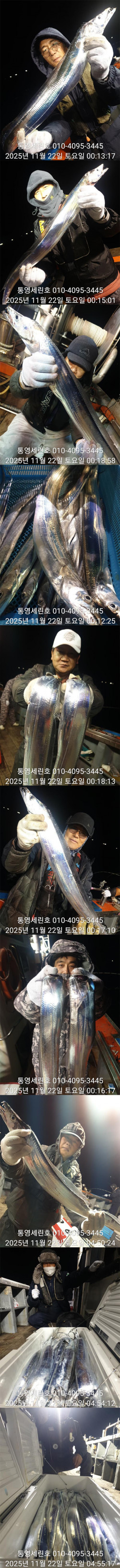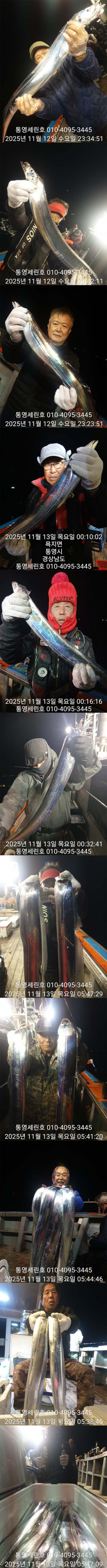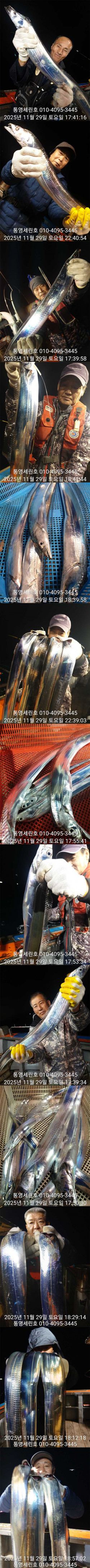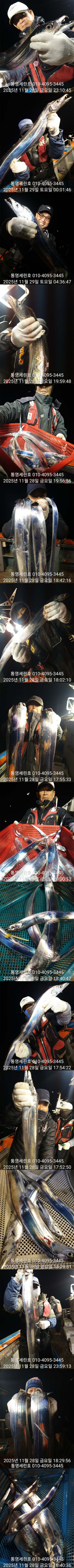 안녕하세요 세린호 선장입니다 날씨가 많이 추워젔네요(외투 필수)가을 왕갈치들 오늘도 대 성공하고 철수합니다☆☆ 11월 갈치 오후2시 출항☆☆ 3 일 월요일 갈치 3자리 가능 4 일 화요일 갈치 예약 가능 5 일 수요일 갈치 예약 가능 6 일 목요일 갈치 예약 가능 7 일 금요일 갈치 예약 가능 갈치 오후2시 출항 철수새벽4~5시 사무실7~8시 도착새벽늦게 갈치피딩시 날샐대까지 연장들어갑니다 갈치 2시출항 철수새벽4~5시 사무실7~8시 도착 갈치 선비1인 20만원 외부 어군탐지 설치넓고 편한낚시를위해 월~목 16석 금토일 17석연속 대박조황시 주중풀 17석으로개인간격 3.5m 2벌채비가능 그래도공간이 운동장급 많은이용부탁드립니다★세린호예약문의 ☎010-4095-3445★세린호 선 장 ☎010-4100-3445 (제로쿨서울 경기권출조시)예약문의 010-9425-4123 ★승선시 필수사항★구명조끼 꼭 착용하셔야 됩니다(구명조끼 미착용 낚시객 벌금100만원)선내에서 음주금지입니다 ★★통영세린호' 밴드★★ 이름 폰번 사진 실명확인후 가입가능https://band.us/n/a3ae70yaH5y81 ★세린호예약문의 ☎010-4095-3445★세린호 선 장 ☎010-4100-3445 김민호 계좌번호 하나은행 010 4100 3445 607 네비게이션 주소 : 경남 통영시 산양읍 산양일주로 602 *** 통영 세린호 예약 안내 ***예약문의 : 010-4095-3445오시는길 : 경남 통영시 산양읍 산양일주로 602홈페이지 : http://serinho.sunsang24.com/