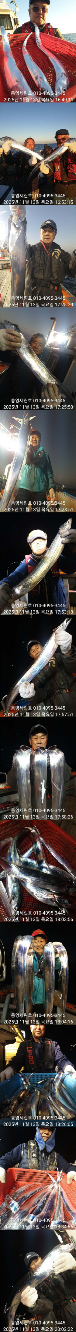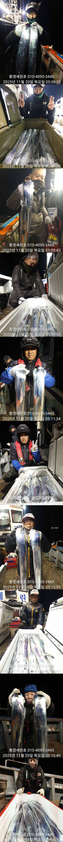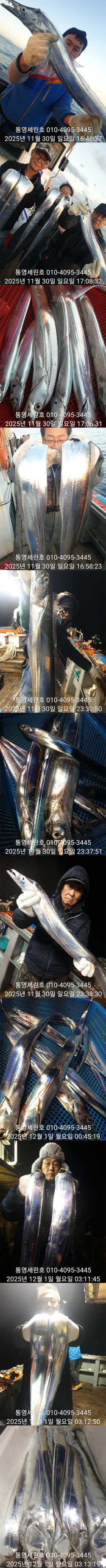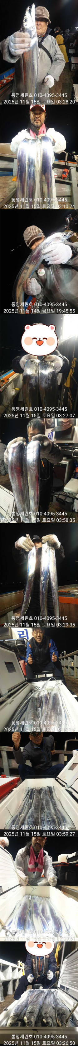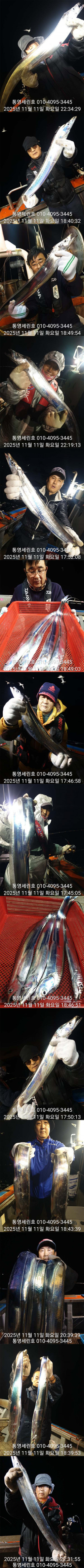 안녕하세요 세린호 선장입니다 날씨가 많이 추워젔네요(외투 필수)가을 왕갈치들 오늘도 대 성공하고 철수합니다☆☆ 11월 갈치 오후2시 출항☆☆ 3 일 월요일 갈치 3자리 가능 4 일 화요일 갈치 예약 가능 5 일 수요일 갈치 예약 가능 6 일 목요일 갈치 예약 가능 7 일 금요일 갈치 예약 가능 갈치 오후2시 출항 철수새벽4~5시 사무실7~8시 도착새벽늦게 갈치피딩시 날샐대까지 연장들어갑니다 갈치 2시출항 철수새벽4~5시 사무실7~8시 도착 갈치 선비1인 20만원 외부 어군탐지 설치넓고 편한낚시를위해 월~목 16석 금토일 17석연속 대박조황시 주중풀 17석으로개인간격 3.5m 2벌채비가능 그래도공간이 운동장급 많은이용부탁드립니다★세린호예약문의 ☎010-4095-3445★세린호 선 장 ☎010-4100-3445 (제로쿨서울 경기권출조시)예약문의 010-9425-4123 ★승선시 필수사항★구명조끼 꼭 착용하셔야 됩니다(구명조끼 미착용 낚시객 벌금100만원)선내에서 음주금지입니다 ★★통영세린호' 밴드★★ 이름 폰번 사진 실명확인후 가입가능https://band.us/n/a3ae70yaH5y81 ★세린호예약문의 ☎010-4095-3445★세린호 선 장 ☎010-4100-3445 김민호 계좌번호 하나은행 010 4100 3445 607 네비게이션 주소 : 경남 통영시 산양읍 산양일주로 602 *** 통영 세린호 예약 안내 ***예약문의 : 010-4095-3445오시는길 : 경남 통영시 산양읍 산양일주로 602홈페이지 : http://serinho.sunsang24.com/