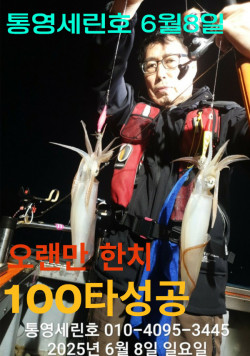 안녕하세요 세린호 선장입니다 좋은 기상속 한치 실력대로20~60수 하셨네요한치낚시1인13만오후3시출항 철수새벽4~5시 사무실7~8시 도착외부 어군탐지 설치넓고 편한낚시를위해 16석개인간격 3.5m 2벌채비가능 그래도공간이 운동장급 많은이용부탁드립니다★세린호예약문의 ☎010-4095-3445★세린호 선 장 ☎010-4100-3445 (제로쿨서울 경기권출조시)예약문의 010-9425-4123 ★승선시 필수사항★구명조끼 꼭 착용하셔야 됩니다(구명조끼 미착용 낚시객 벌금100만원)선내에서 음주금지입니다 ★★통영세린호' 밴드★★ 이름 폰번 사진 실명확인후 가입가능https://band.us/n/a3ae70yaH5y81 ★세린호예약문의 ☎010-4095-3445★세린호 선 장 ☎010-4100-3445 김민호 계좌번호 하나은행 010 4100 3445 607 네비게이션 주소 : 경남 통영시 산양읍 산양일주로 602 *** 통영 세린호 예약 안내 ***예약문의 : 010-4095-3445오시는길 : 경남 통영시 산양읍 산양일주로 602홈페이지 : http://serinho.sunsang24.com/